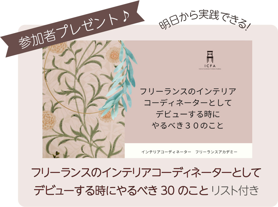 特典「フリーランスのインテリアコーディネーターとしてデビューする時にやるべき30のこと」リスト付き